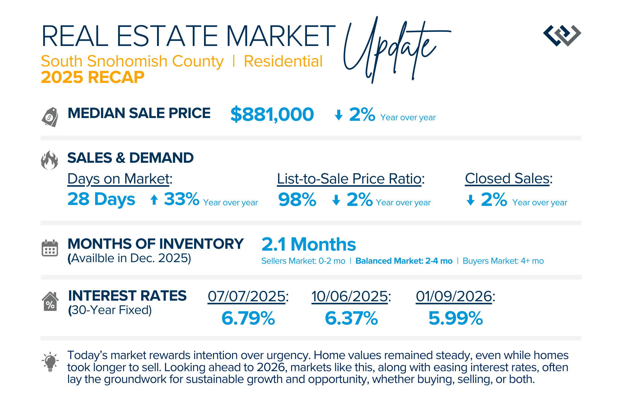 Today’s market rewards intention over urgency. Throughout 2025, sellers who focused on thoughtful preparation, strategic pricing, and strong presentation continued to achieve solid outcomes—even as buyers became more selective. Home values largely held steady even while homes generally took a bit longer to sell; this reflected more selective buyers, not a lack of demand. Buyers benefited from more balanced conditions, with greater opportunity to evaluate options, negotiate thoughtfully, and make confident decisions. As mortgage rates showed signs of easing and competition normalized, the market shifted away from extremes and back toward fundamentals.